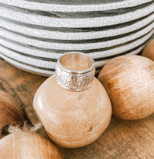 Sterling Silver Plated Floral/Leaves Spinner Wide Band Ring