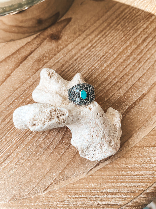Bali Wide Band Sterling Silver Ring with a small Turquoise Stone