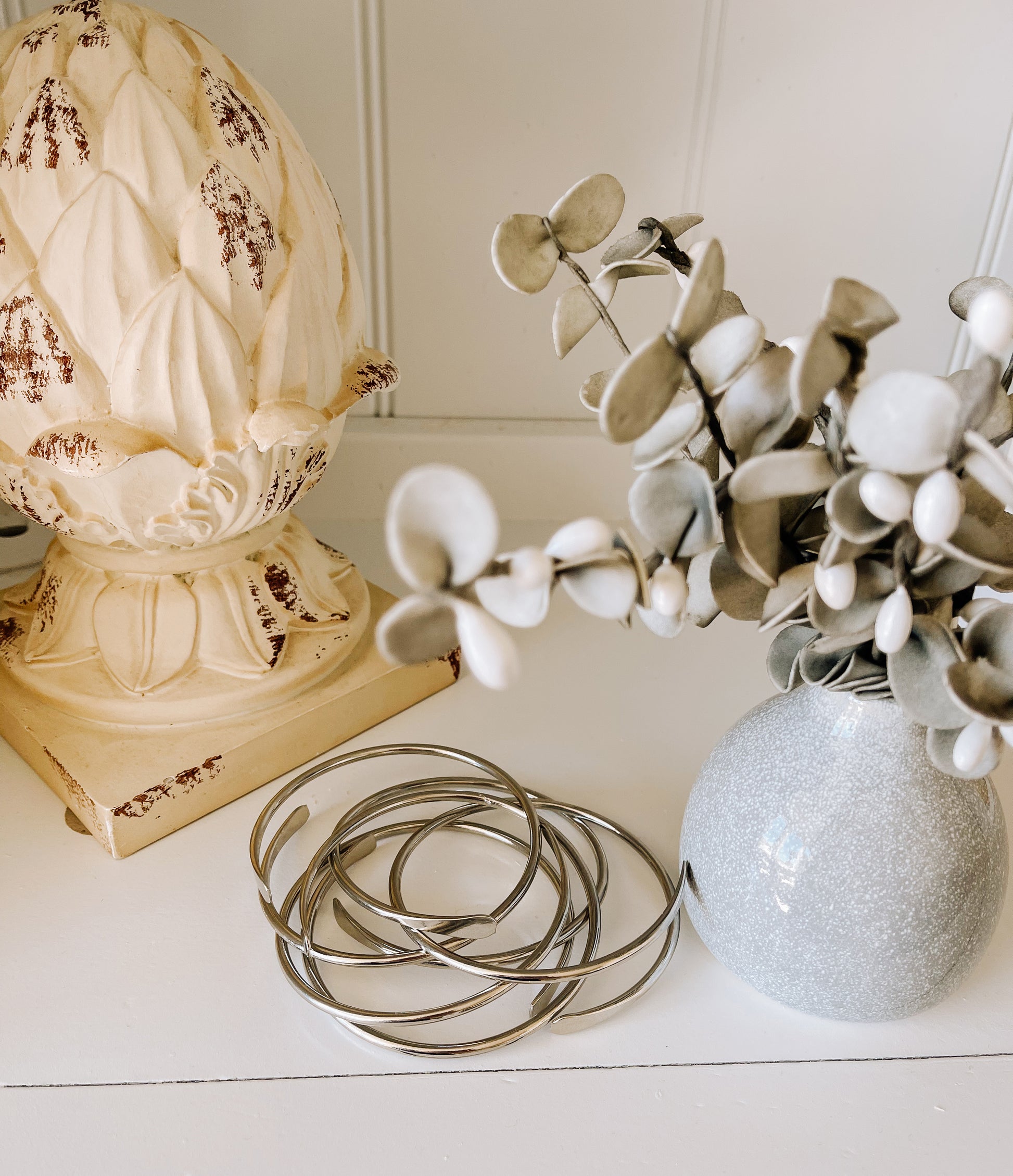 This 5-piece set of adjustable silver cuff bangles is the perfect addition to your jewelry collection. Made with high-quality materials, these bangles offer a timeless and versatile look that can be easily adjusted to fit any wrist size. Elevate your style with these elegant and modern pieces.