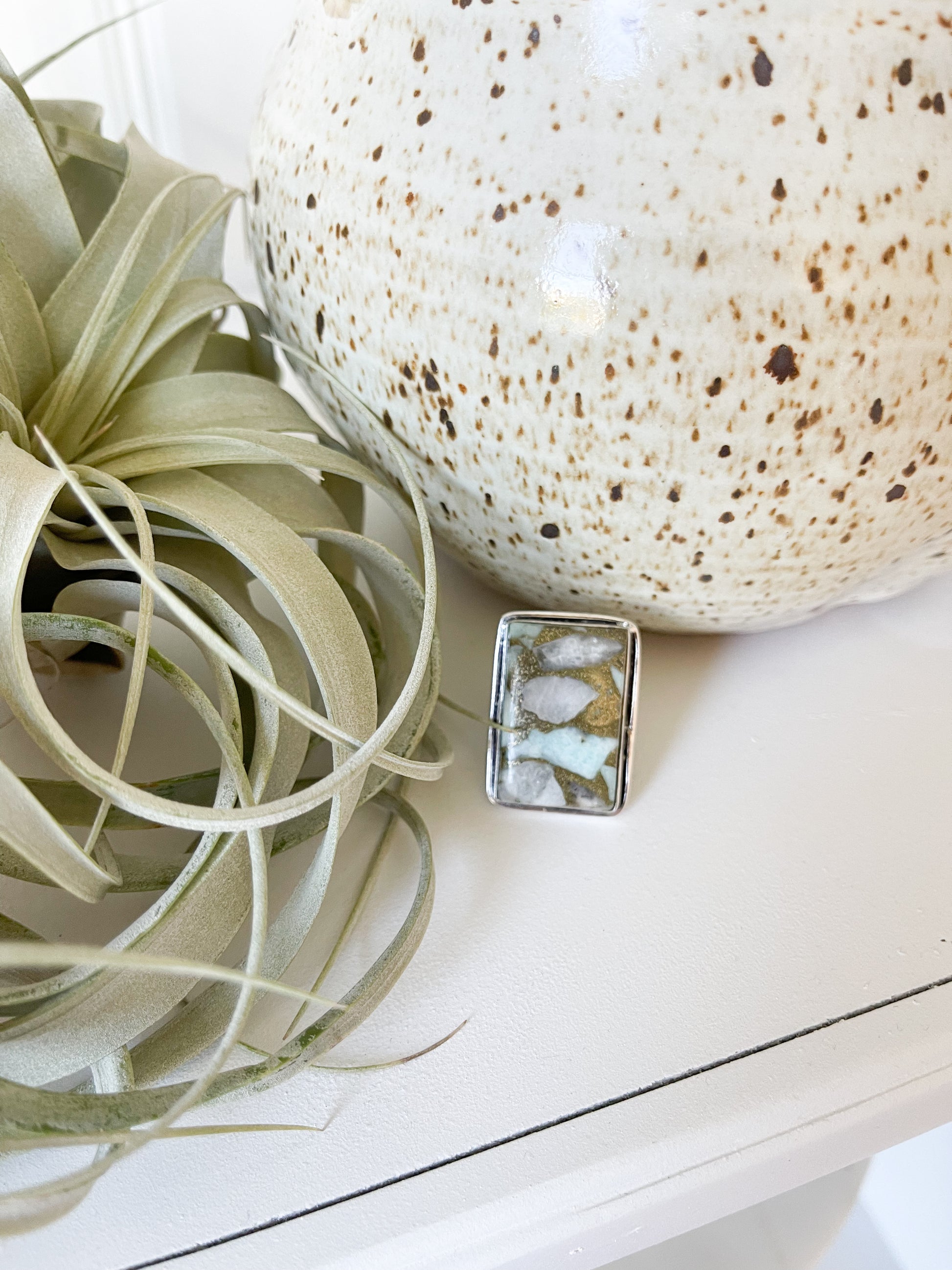 This Copper Larimar Rectangle Sterling Silver Ring features a striking rectangular Larimar stone set in sterling silver, accented with warm copper details. Its expert craftsmanship highlights the unique blue-green hues of Larimar, offering both elegance and durability. Ideal for collectors and those seeking a refined statement piece, this ring combines natural beauty with skilled metalwork for lasting wear.