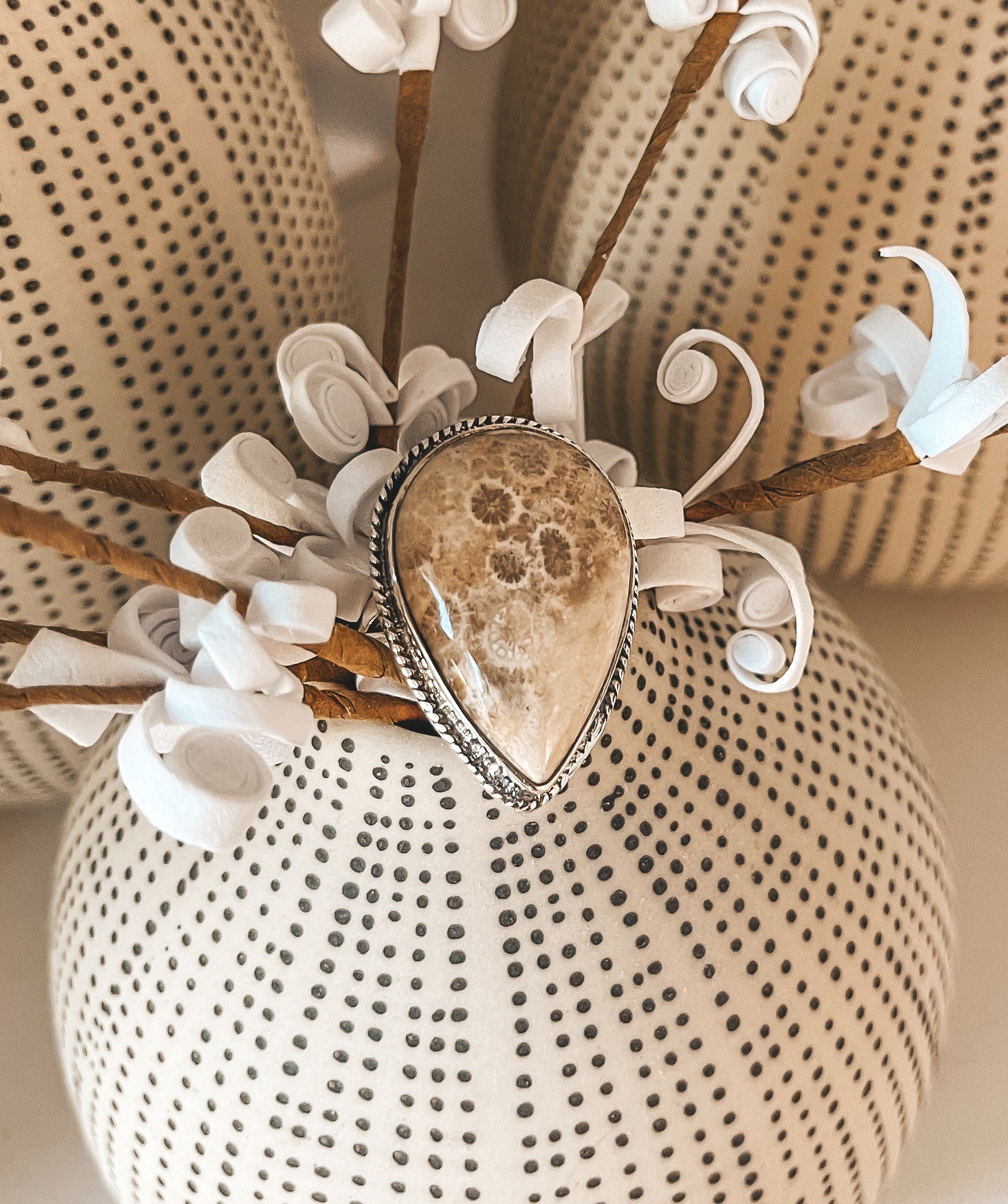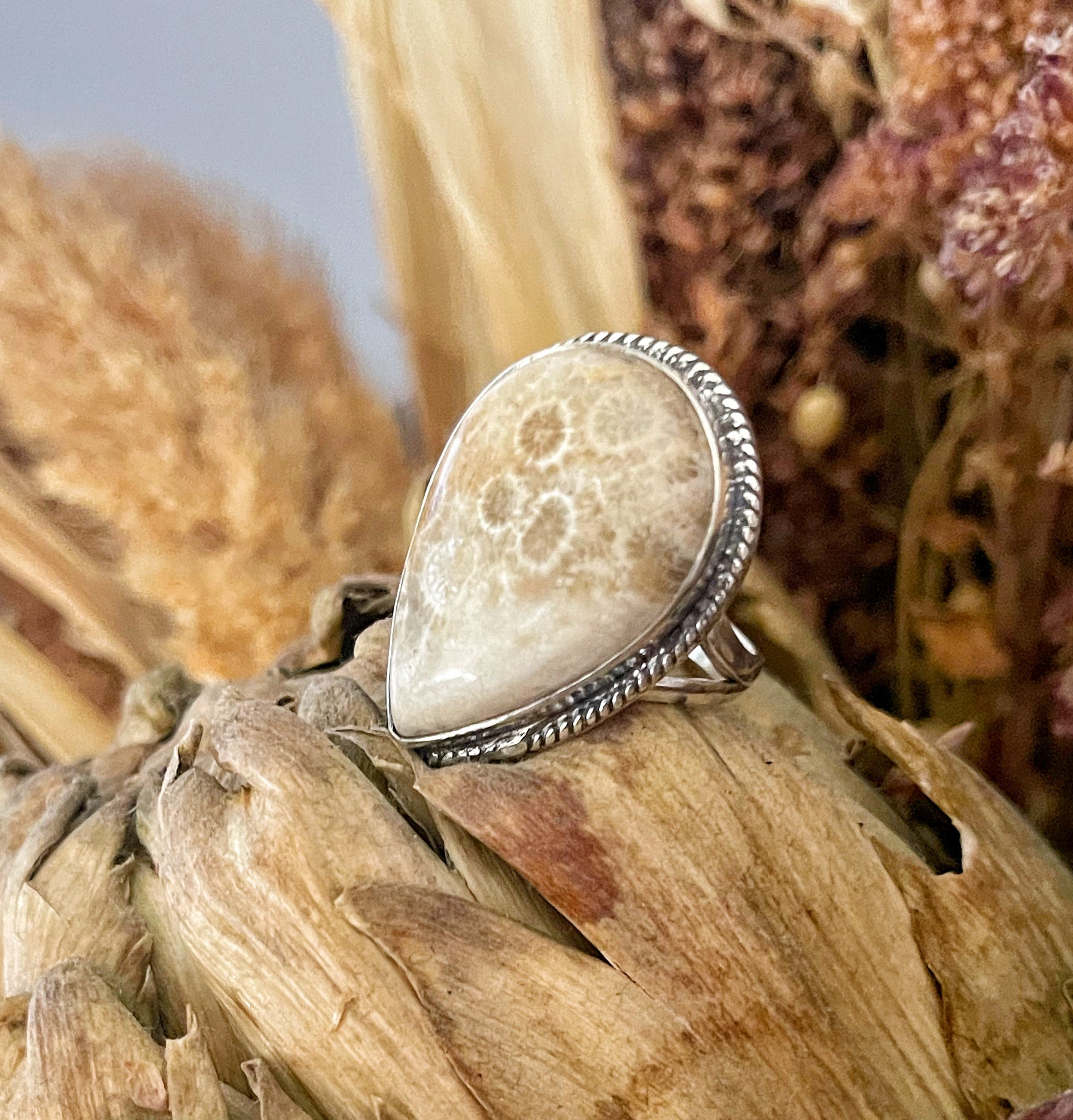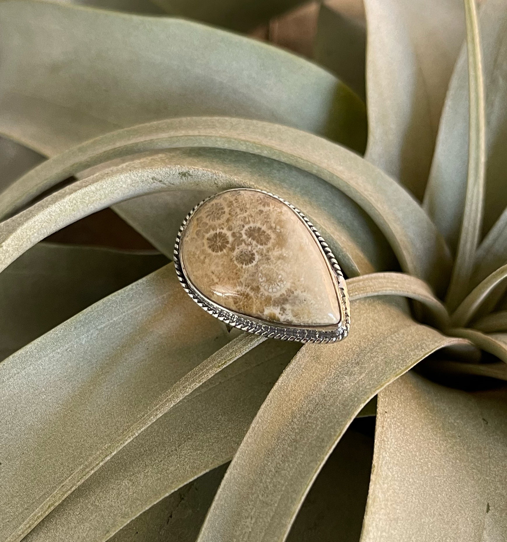 This sterling silver ring features a genuine fossil coral gemstone, showcasing intricate natural patterns formed over millions of years. Expertly crafted, the ring combines timeless elegance with a unique geological story, making it a distinctive addition to any jewelry collection. Its durable sterling silver setting ensures lasting wear while highlighting the fossil’s detailed texture and subtle hues. Ideal for those who appreciate both natural history and refined craftsmanship.