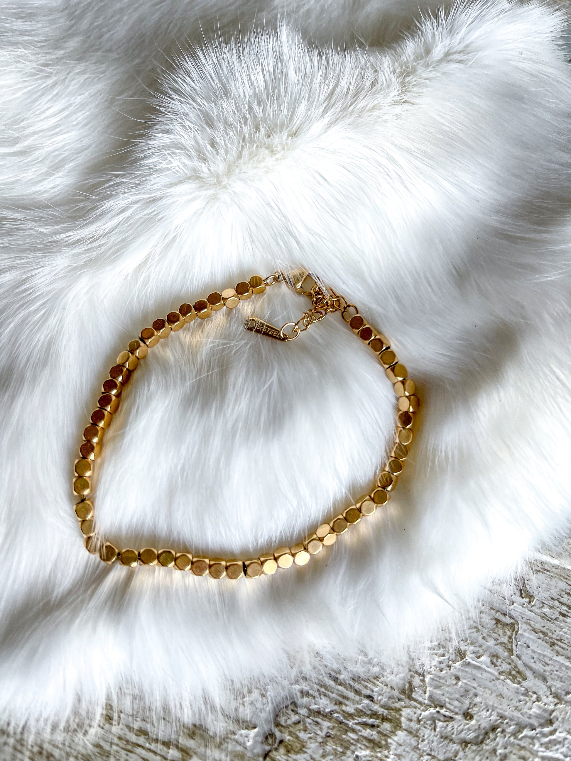 Expertly crafted, this Gold Bead Bracelet adds a touch of elegance to any outfit. It exudes a timeless charm. Perfect for any occasion, this bracelet is a must-have for those seeking to elevate their style.