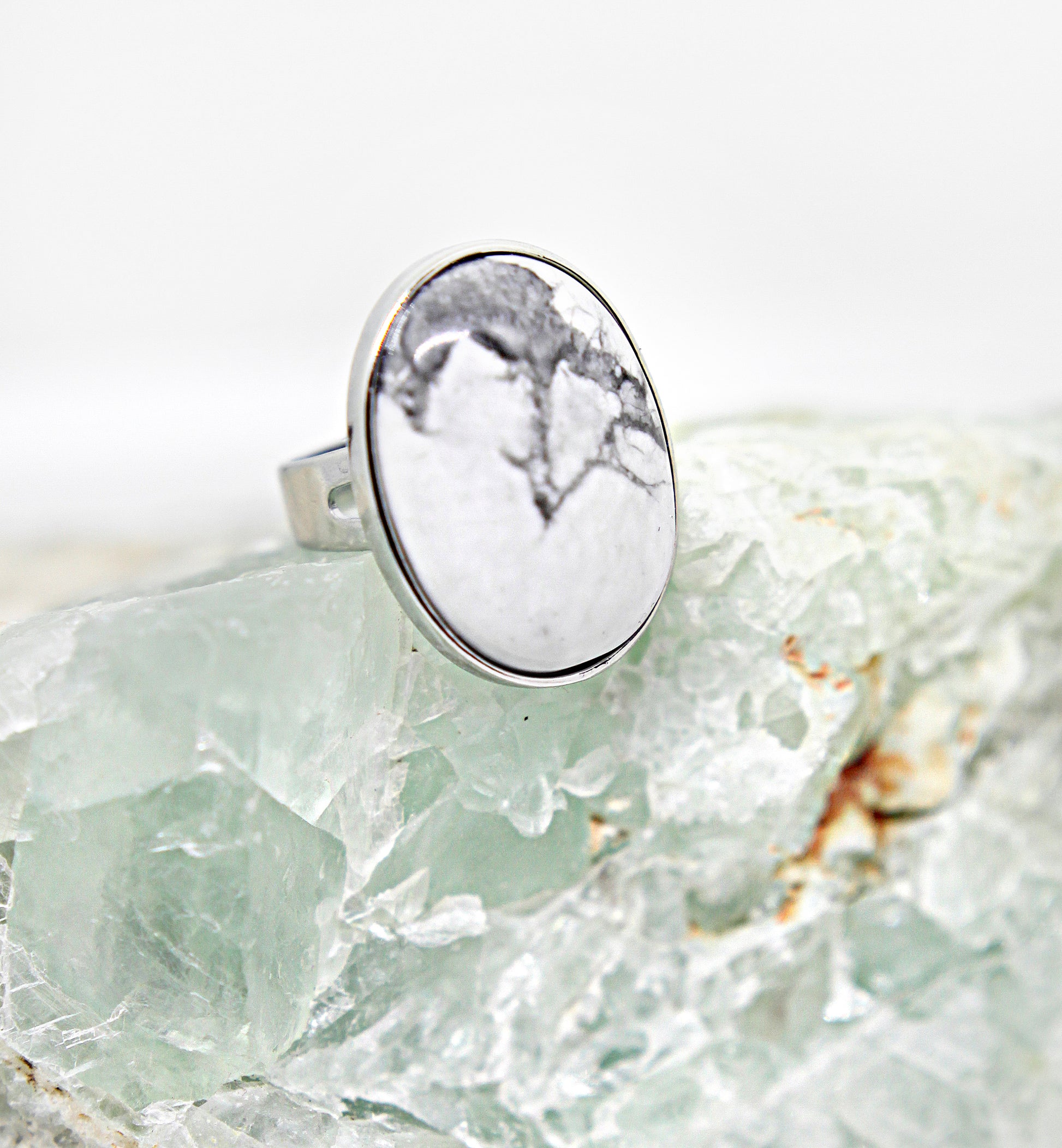 Ring is adjustable but minimum size is 7.5 unless okay overlapping the base of the ring. Please be aware that the black veins in the white turquoise can be different. They can be lighter or darker as well.