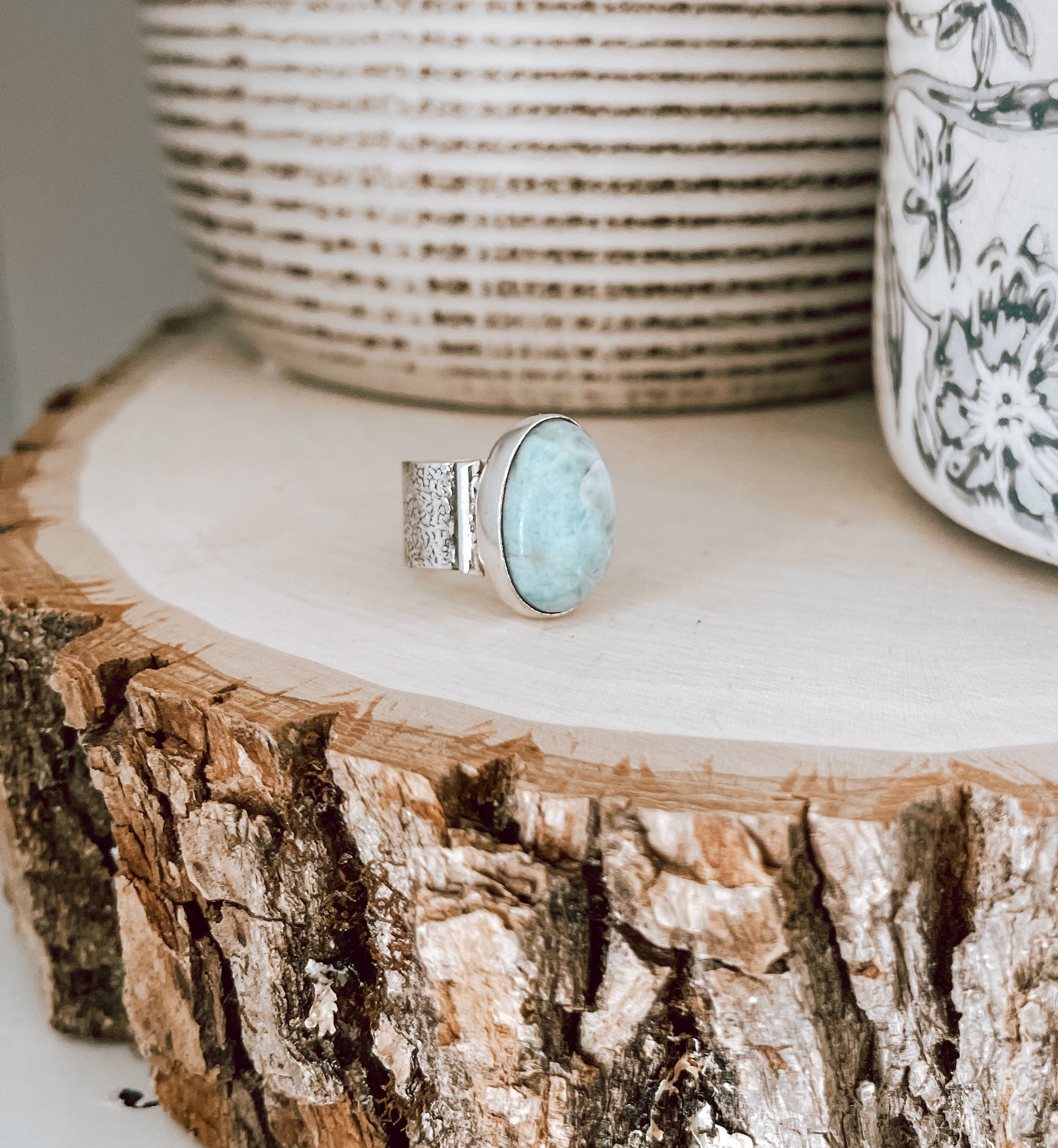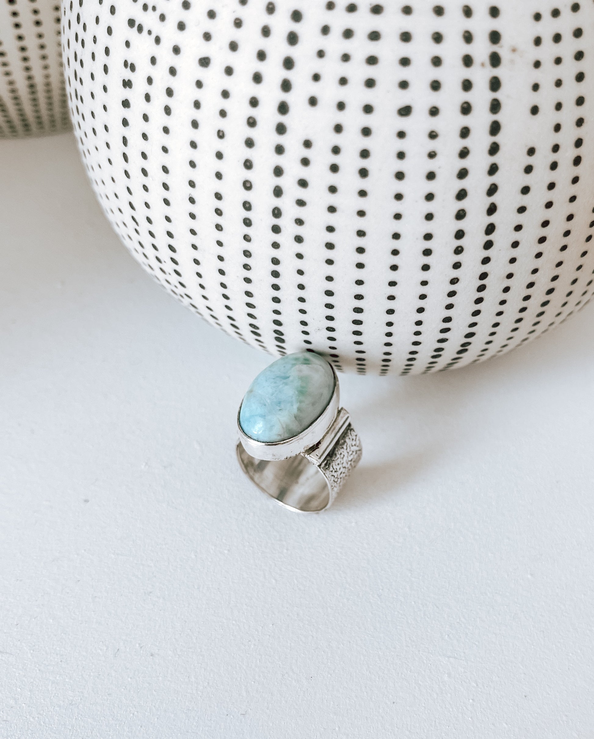 This sterling silver ring features a beautifully polished larimar stone, designed specifically for pinky or midi finger wear. Larimar’s calming blue hues offer a subtle yet sophisticated touch, perfectly complemented by the enduring strength of sterling silver. Ideal for layering or as a distinctive accent, this ring combines expert craftsmanship with natural elegance for a refined accessory that enhances any jewelry collection.