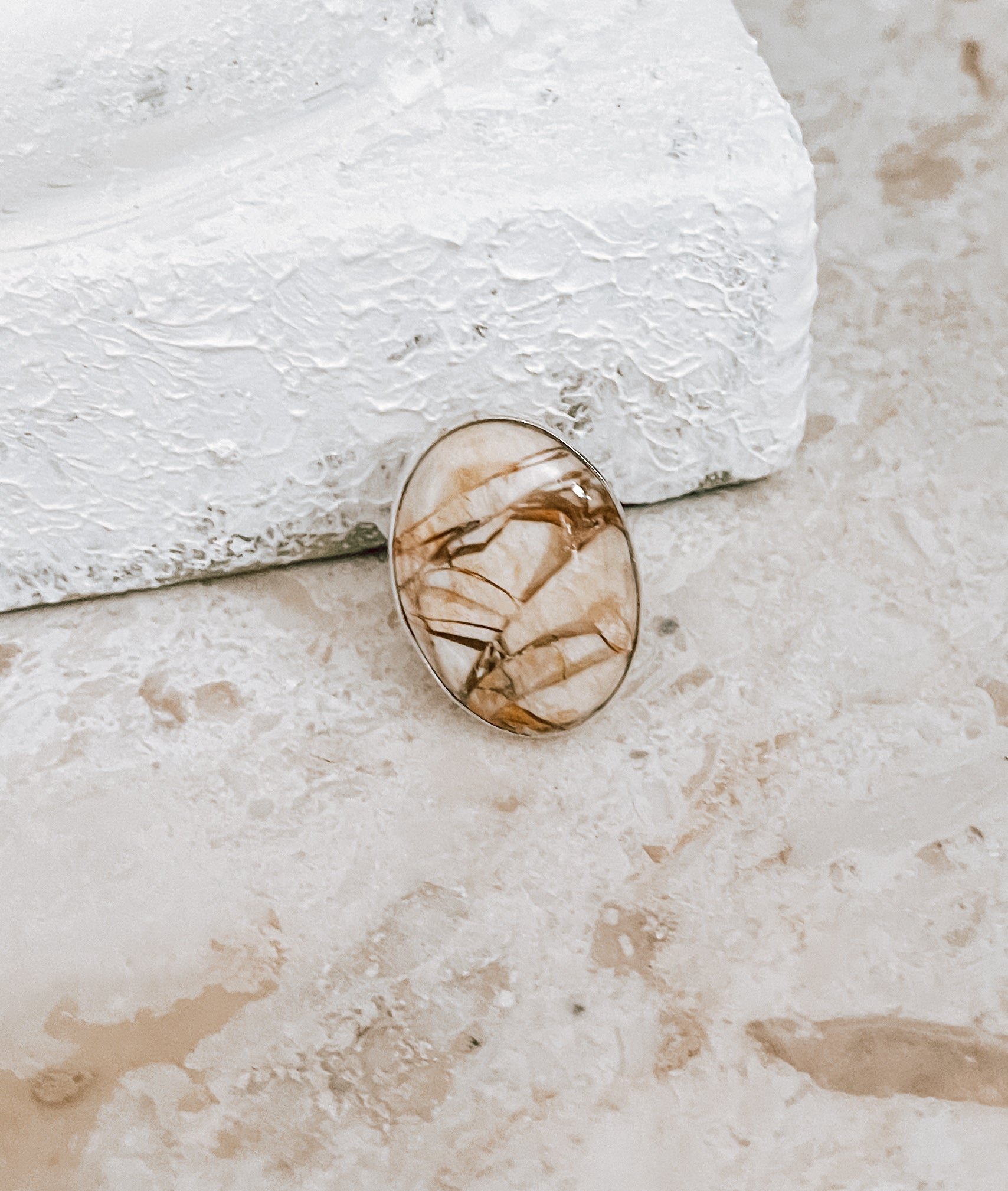 Crafted from genuine sterling silver, this natural stone ring combines timeless elegance with organic beauty. Each piece features a carefully selected stone, showcasing unique color variations and natural characteristics that make it truly one-of-a-kind. The polished silver band provides a refined contrast to the raw authenticity of the stone, creating a sophisticated accessory suitable for everyday wear or special occasions. Sterling silver's durability ensures lasting quality, while the natural stone adds distinctive character and visual interest to your jewelry collection.