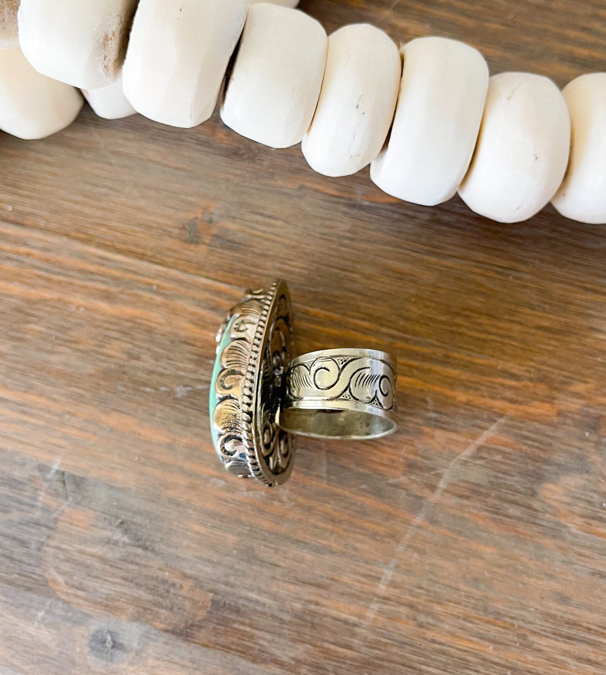 This Turquoise German Silver Adjustable Ring features a vibrant turquoise stone set in durable German silver, ensuring long-lasting wear and a distinctive look. Its adjustable design provides a comfortable fit for various finger sizes, making it a versatile addition to any jewelry collection. Perfect for those who appreciate handcrafted elegance paired with reliable materials.